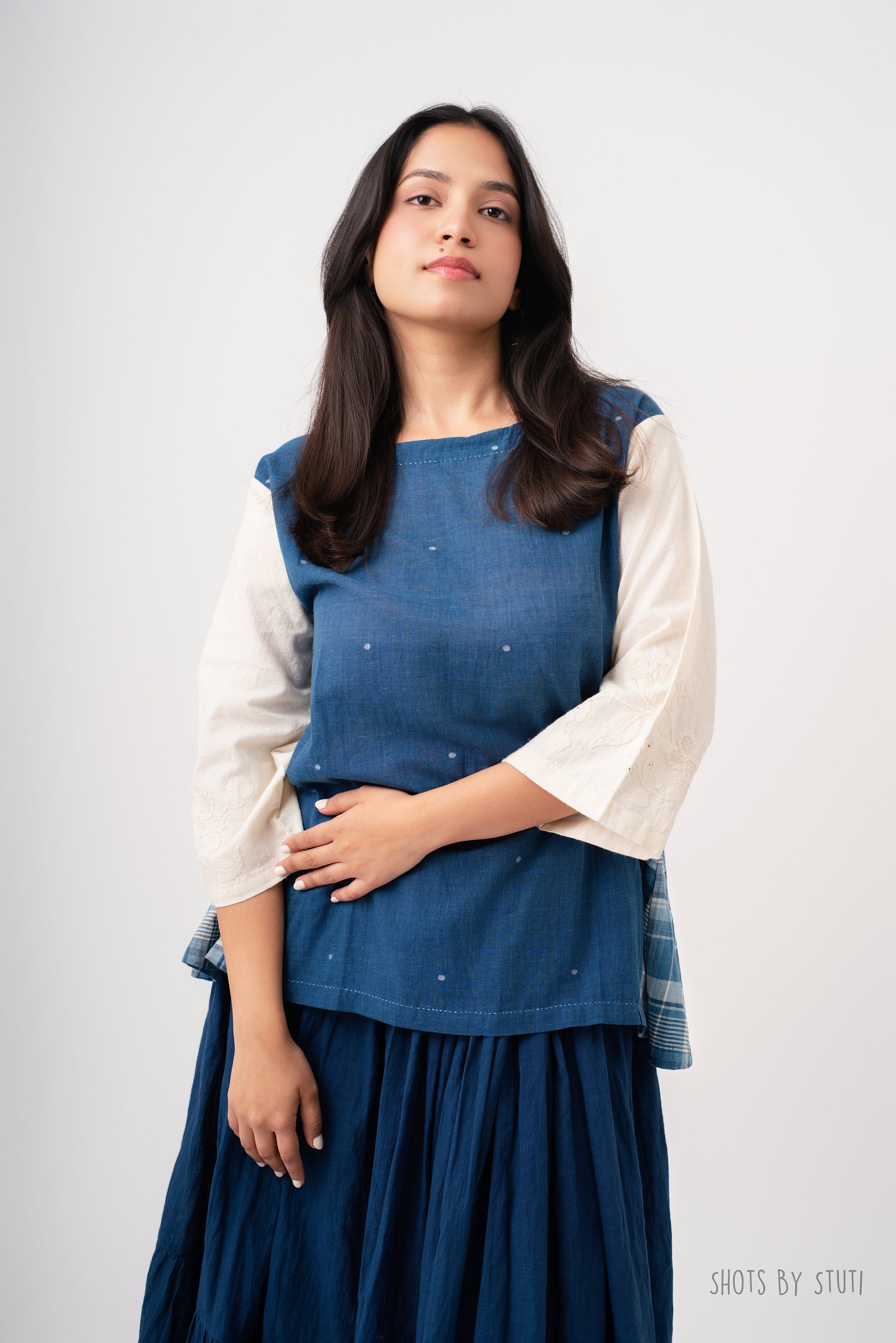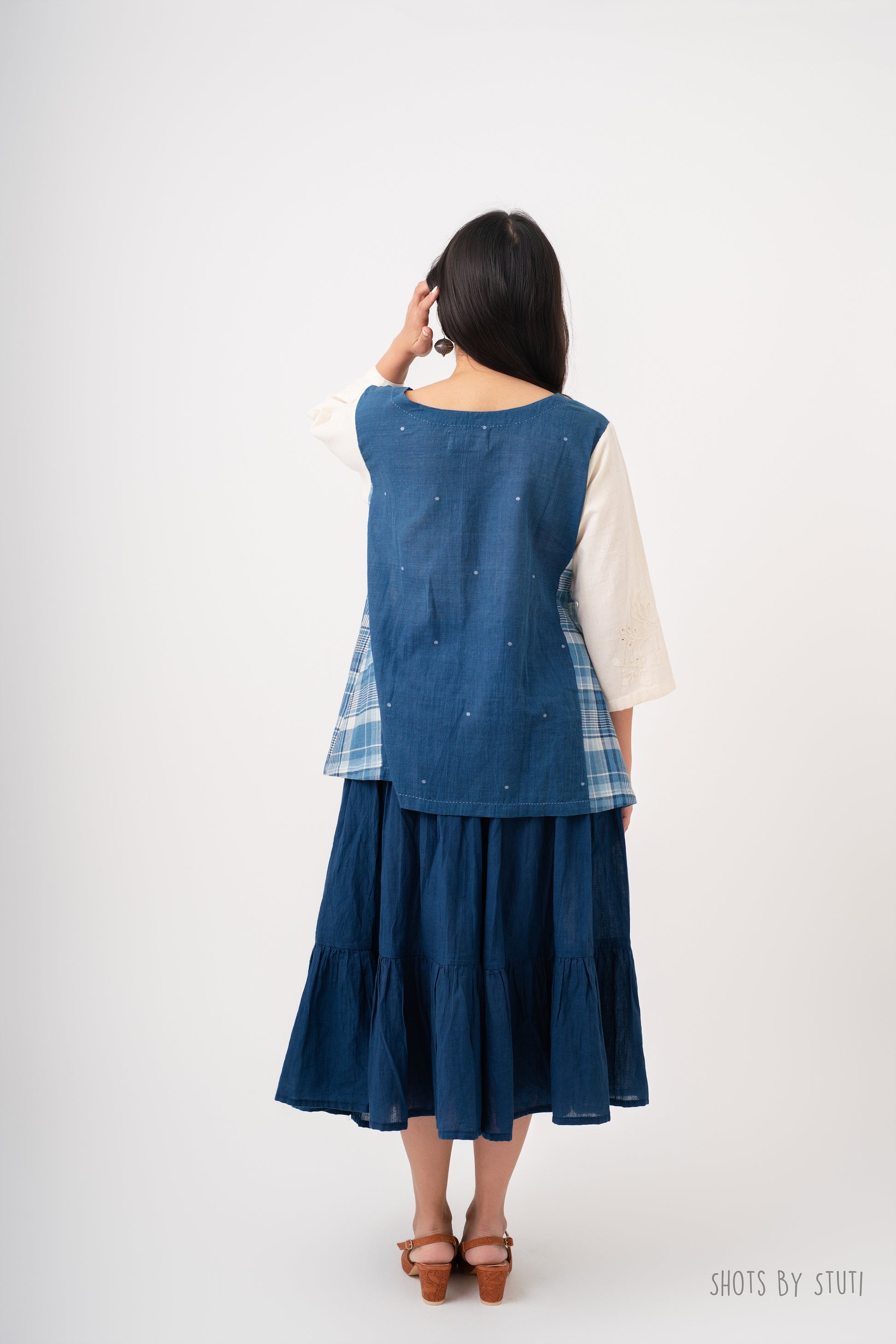 The central front panel is in indigo with white Jamdani dots. Complementing this, the side panels are crafted from a charming checked indigo "gamcha-like" fabric, adding distinct texture.