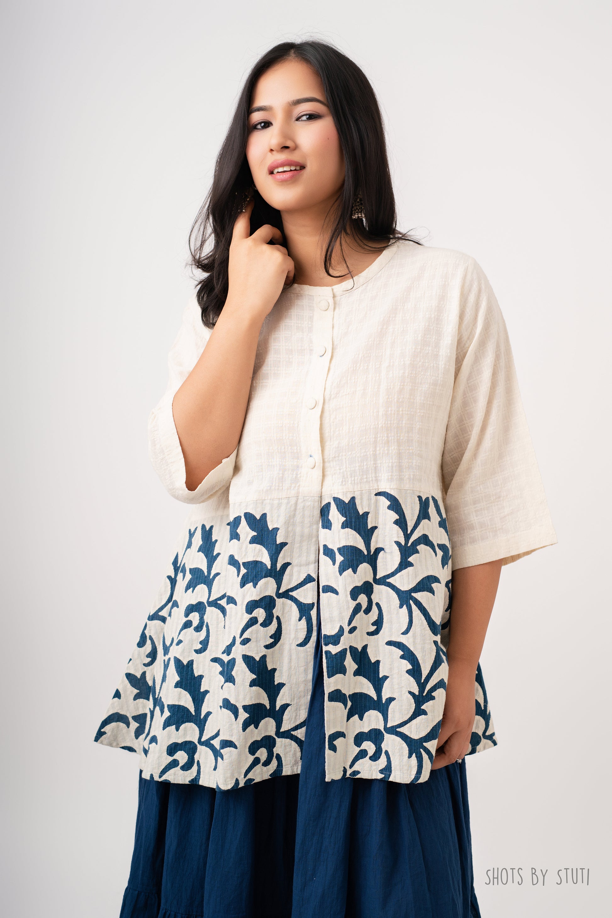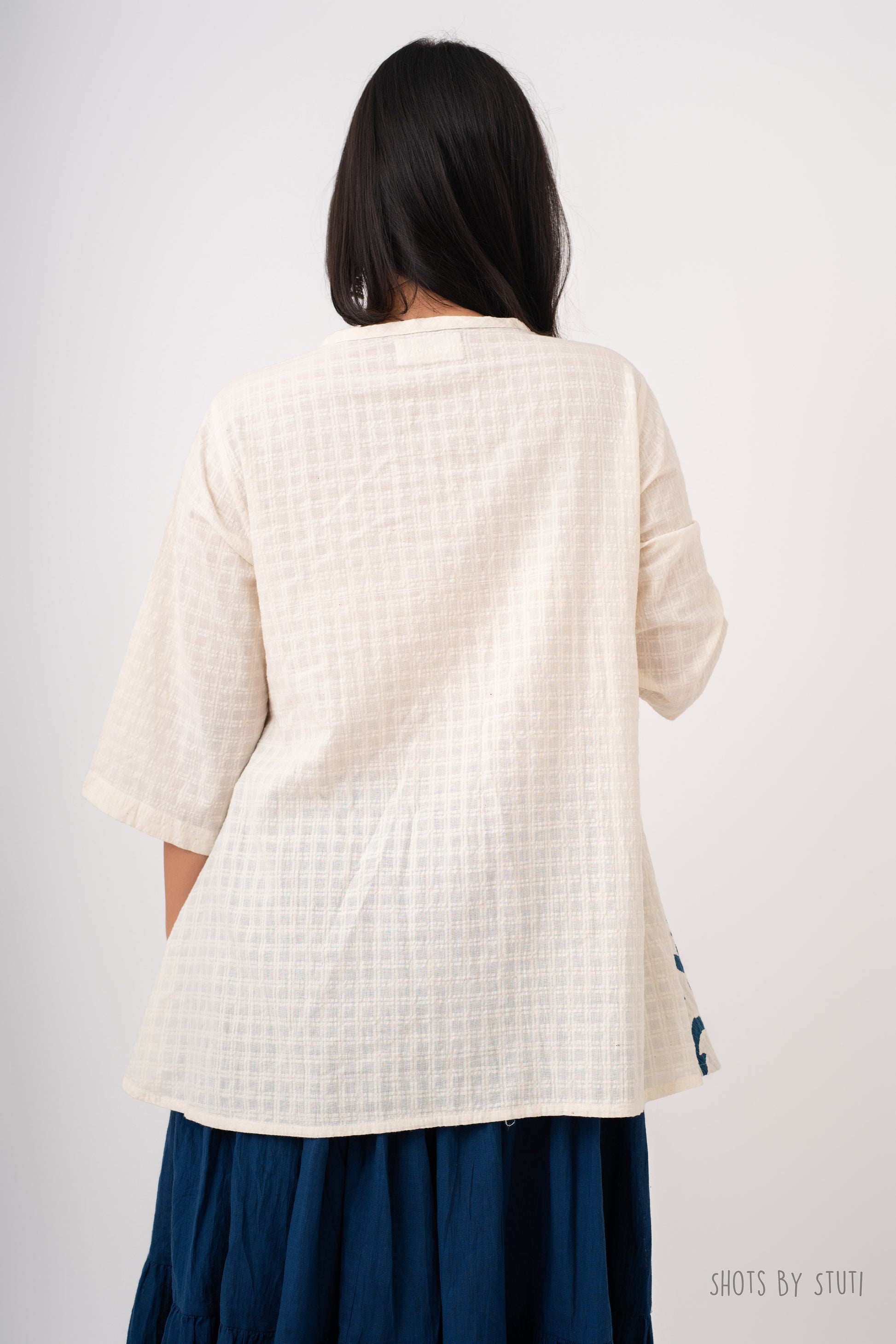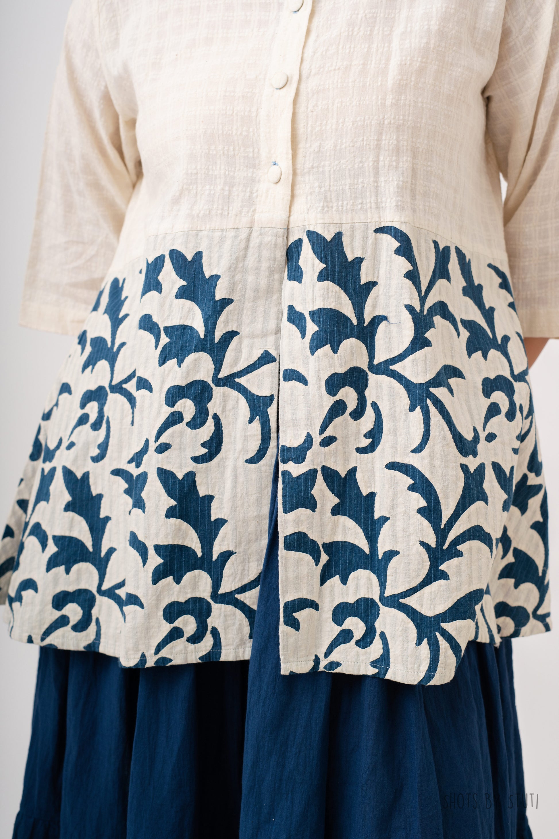 Adorning the shirt is exquisite appliqué work in a deep, rich indigo, thoughtfully placed to enhance its classic lines.