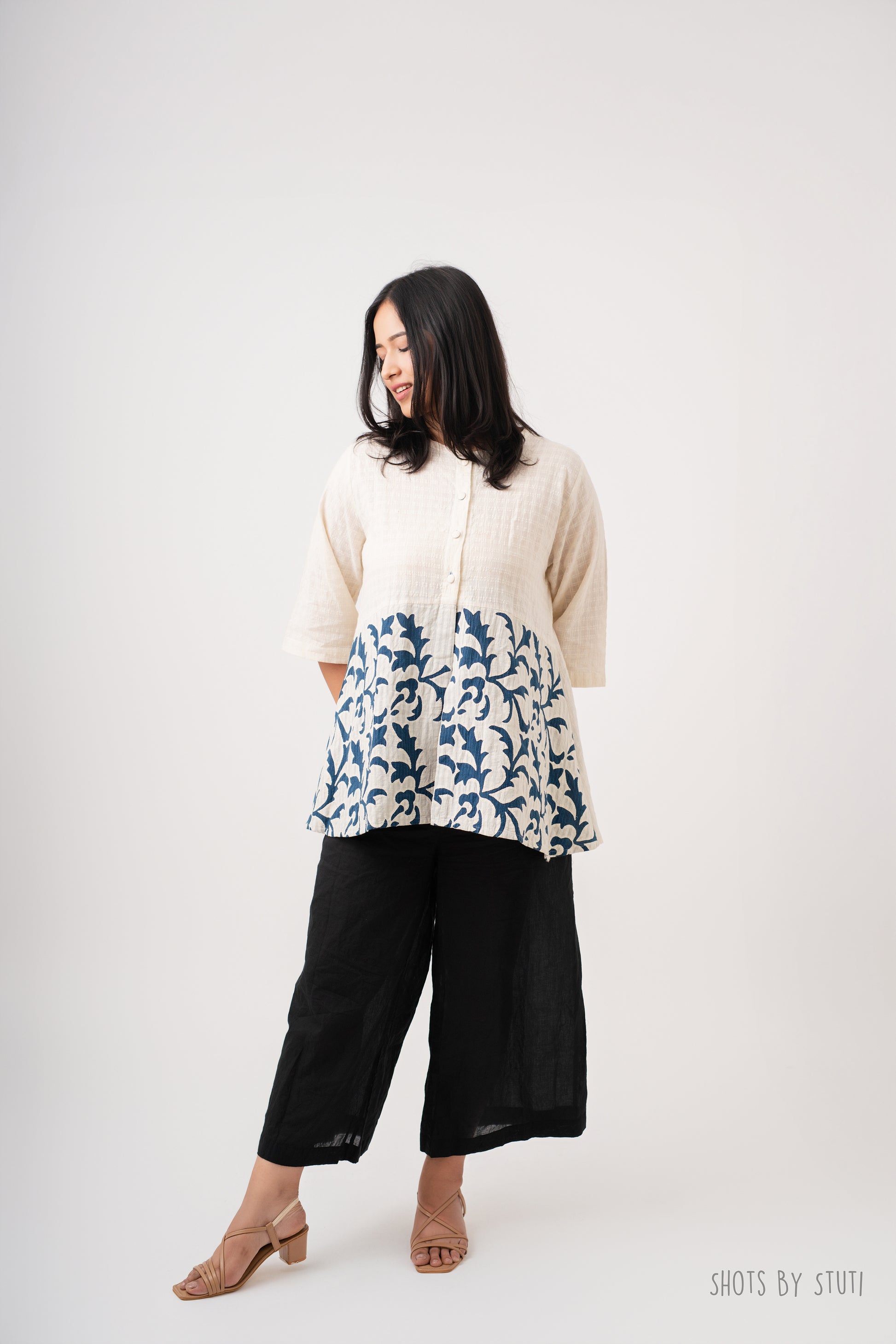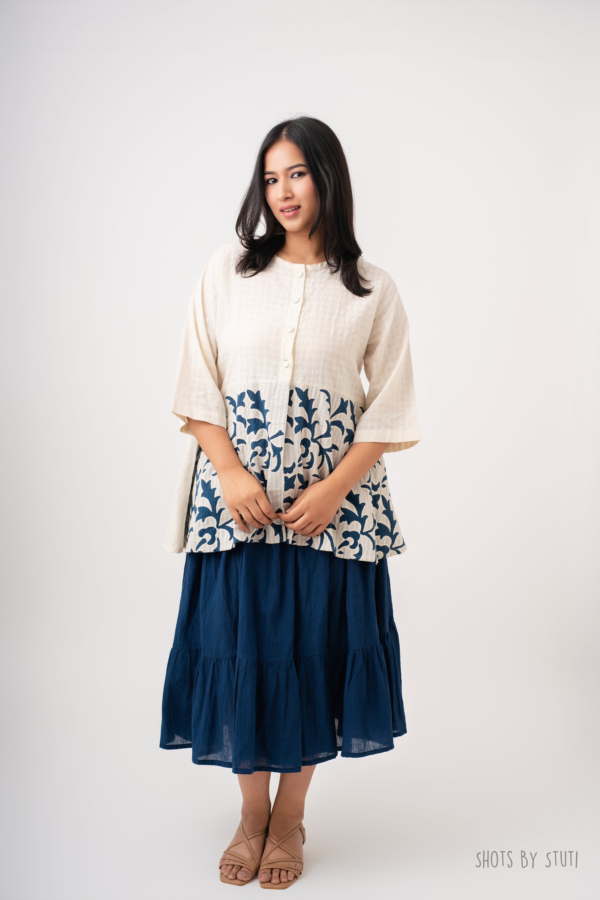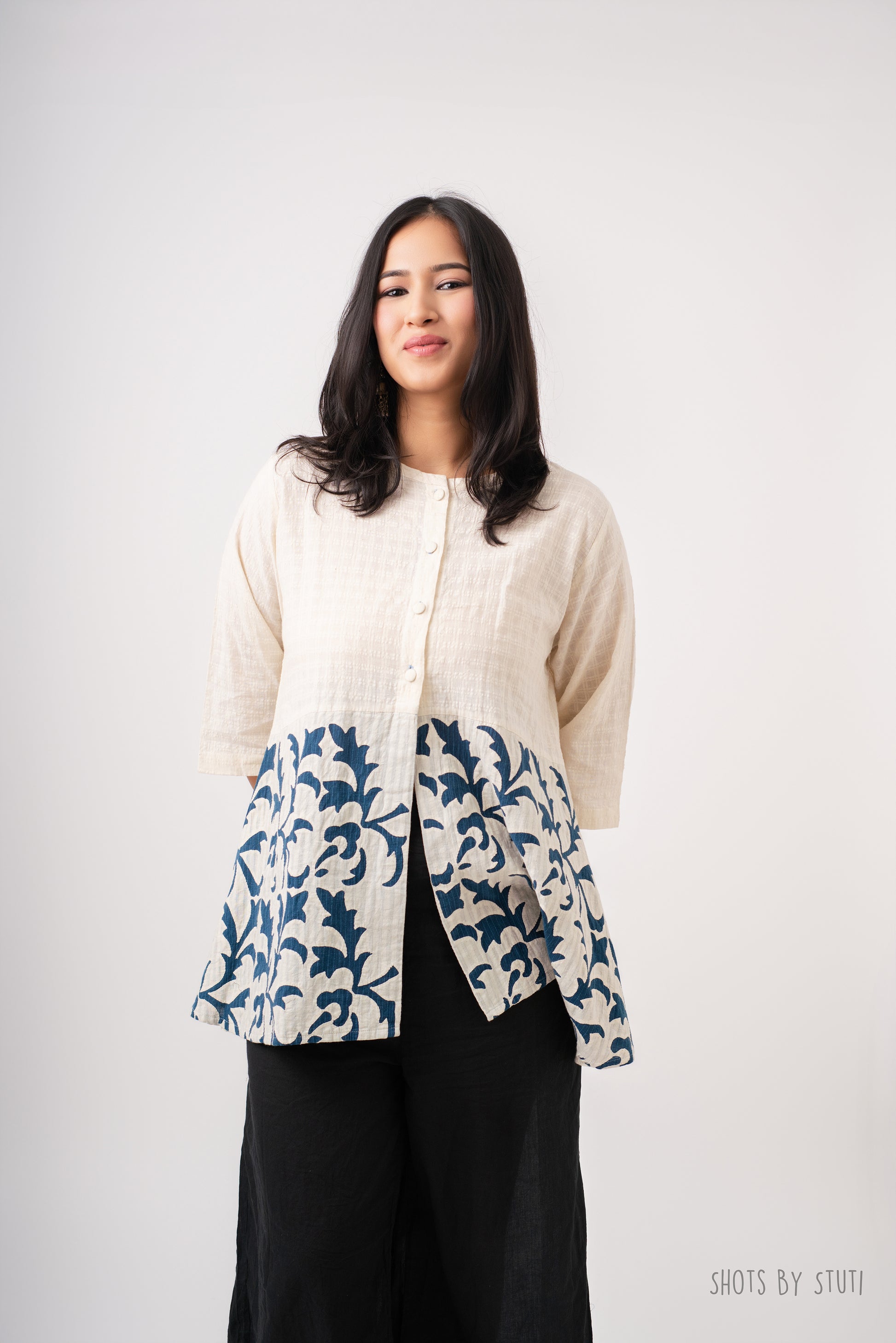 Adorning the shirt is exquisite appliqué work in a deep, rich indigo, thoughtfully placed to enhance its classic lines.