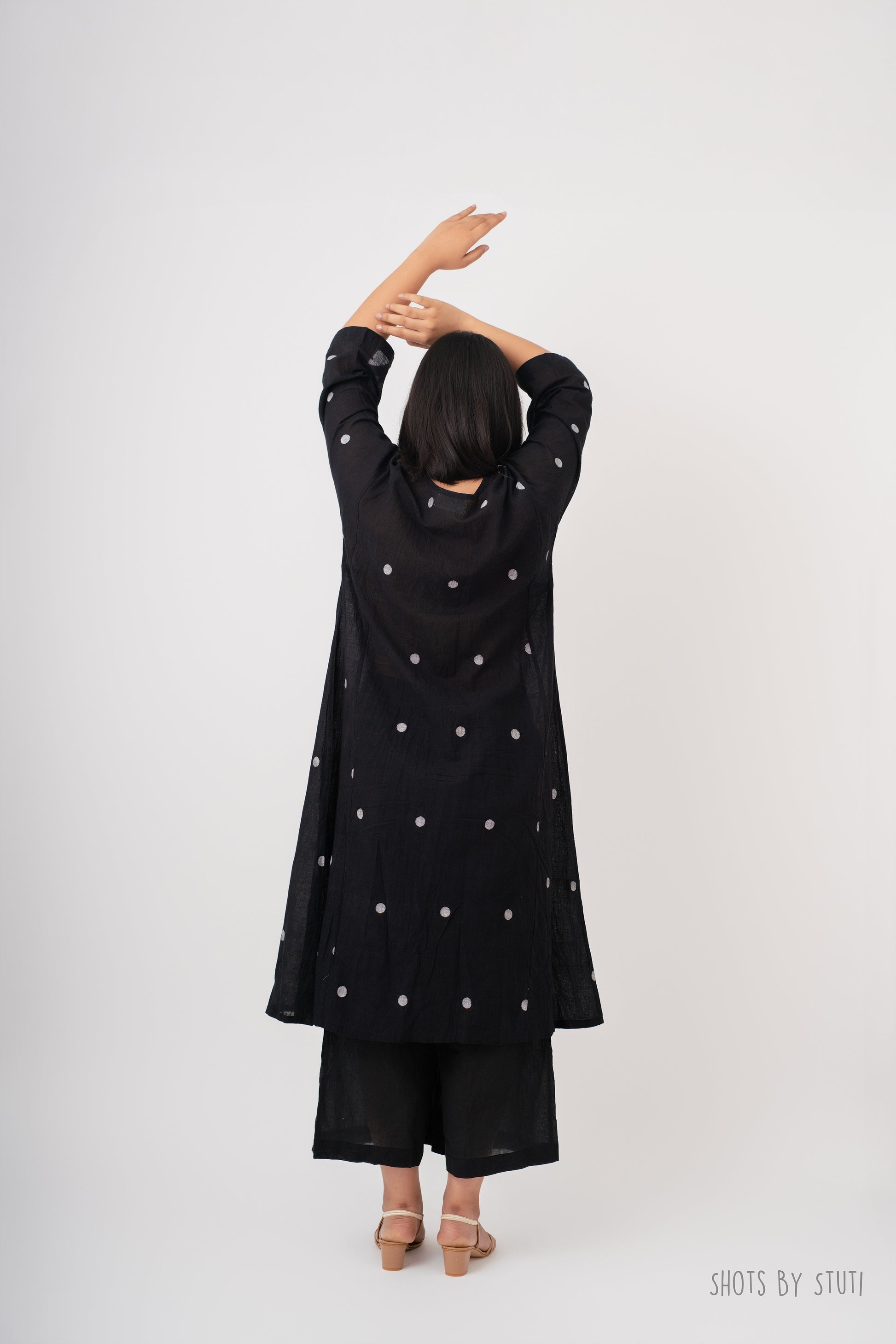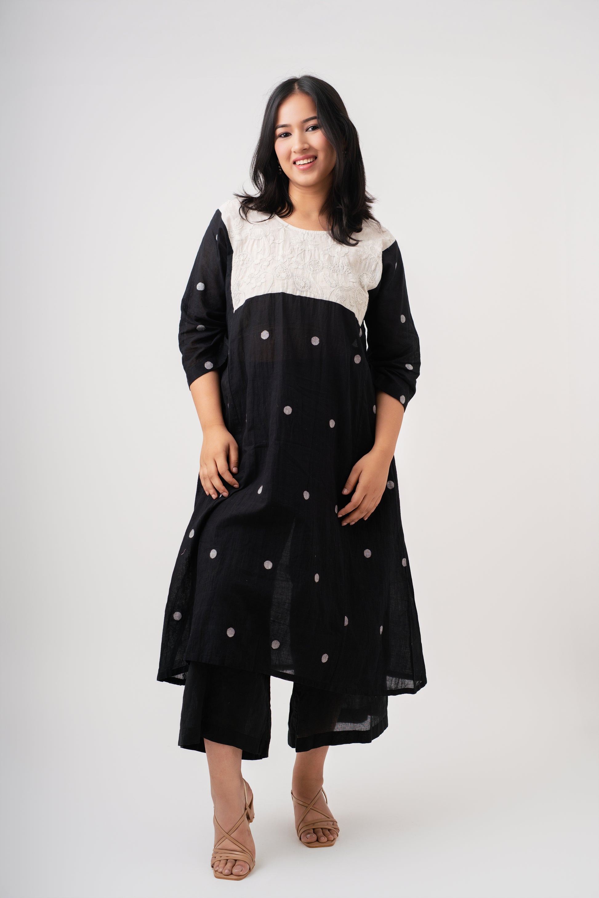 The design is beautifully centered around a truly stunning Chikankari yoke. The delicate stitches of the Chikankari not only enhance the yoke but also provide a captivating contrast to the woven dots of the body, creating a harmonious blend of different traditions.