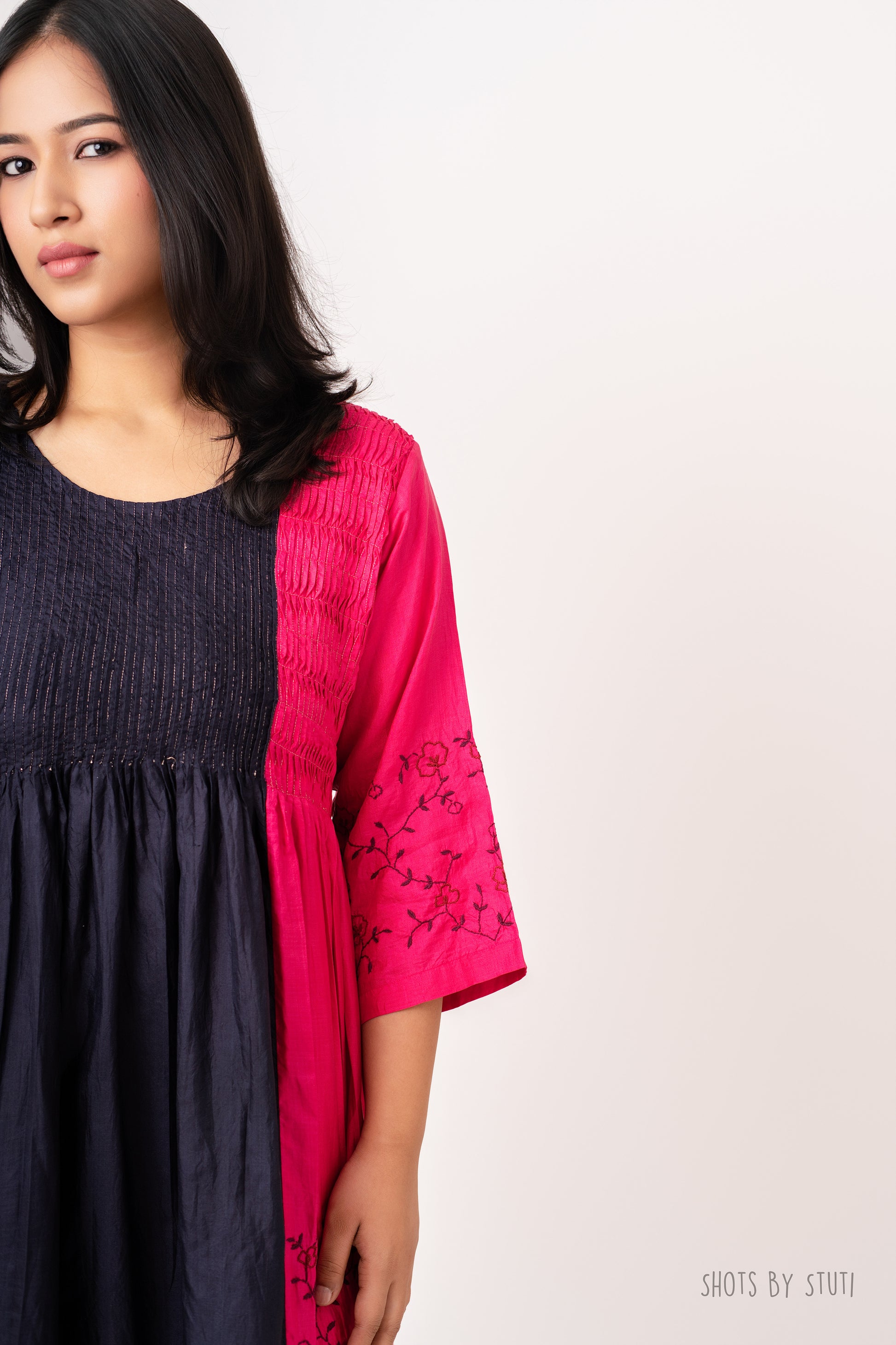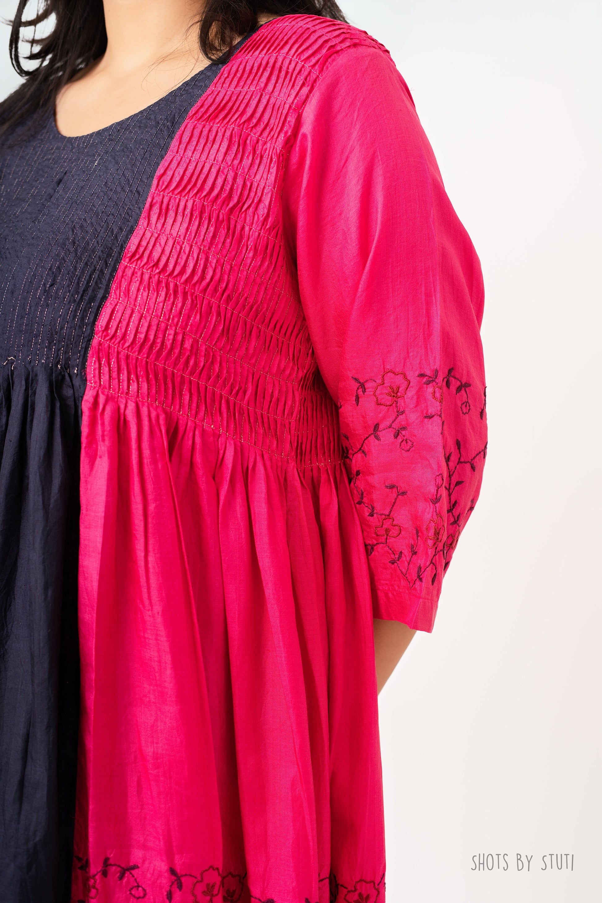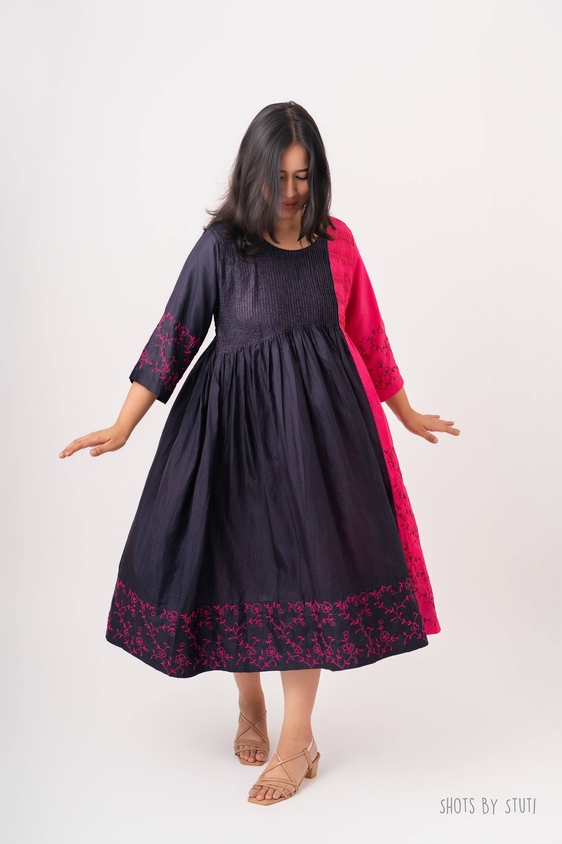 Experience the distinct charm of this artisanal silk dress, presented in a captivating combination of fuchsia and midnight.