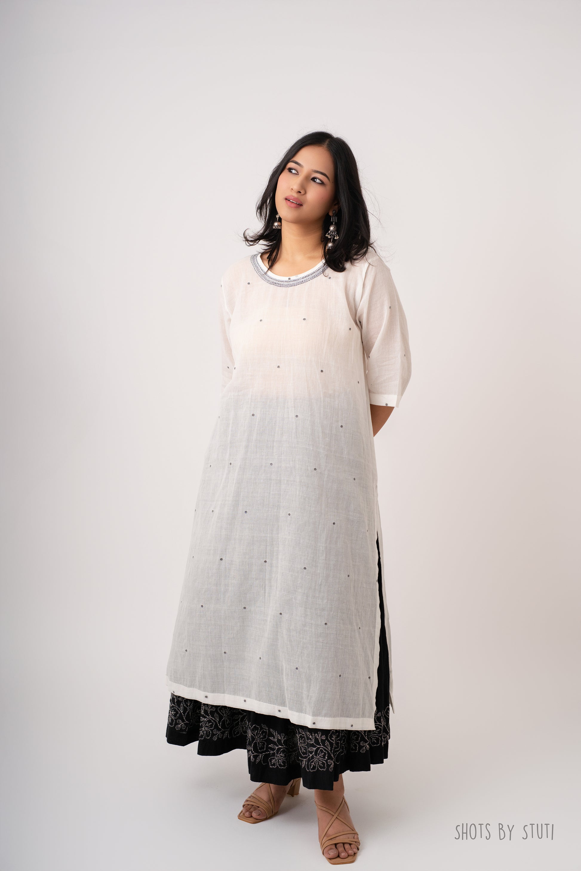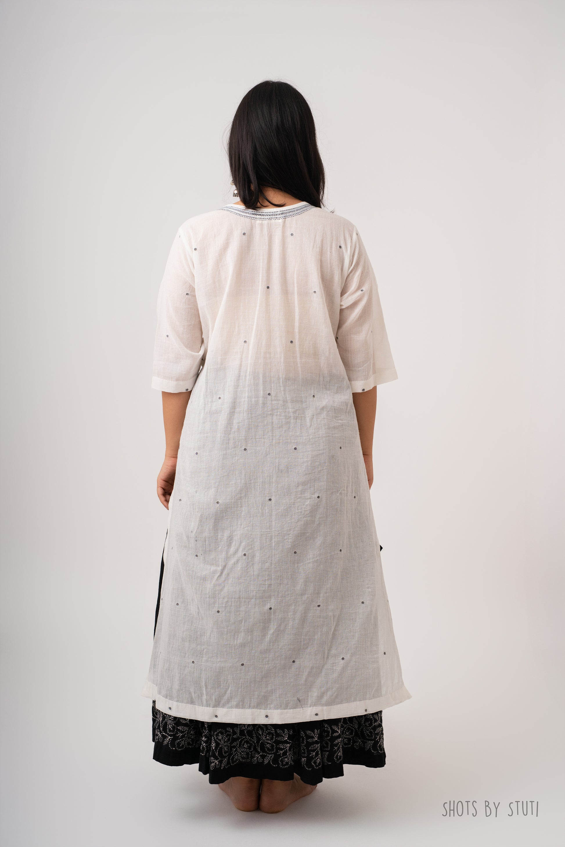 The handwoven fabric base is subtly adorned with classic black Jamdani dots, adding a timeless touch. Its elegant round neckline is a canvas for delicate ombre Tepchi work, where a mesmerizing gradient of color is achieved through meticulous embroidery, creating a truly enchanting detail.